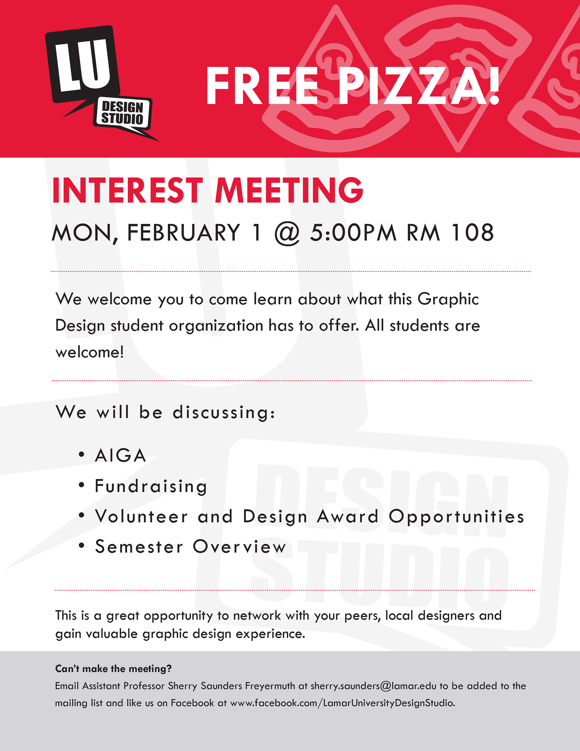 - Produced flyers to recruit new members and promote LU Design Studio as a new organization.